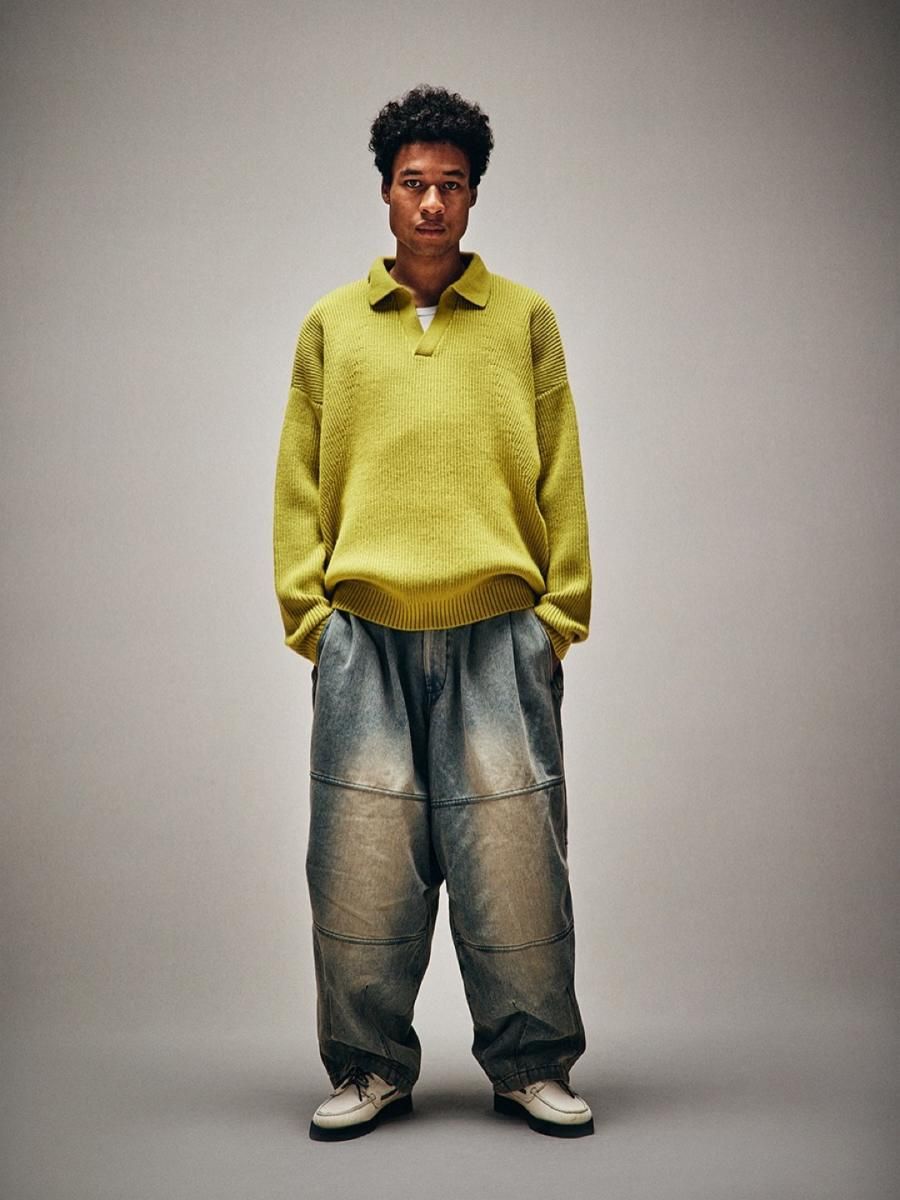 裾を狭め、膝に立体感とゆとりを加えたシルエット。