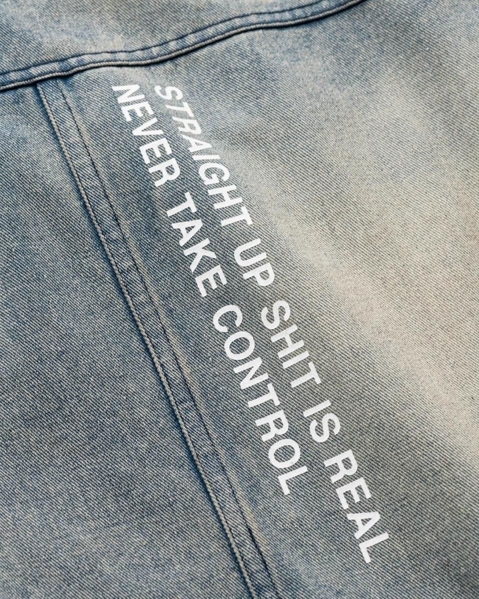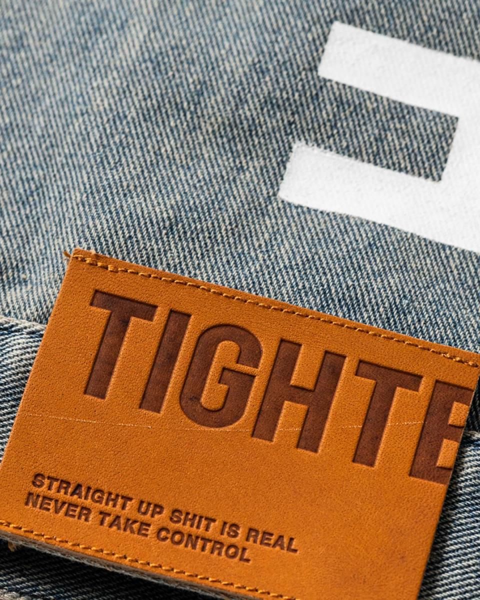 後ろ身頃にブランドロゴを縦にシルクプリントし、その下にはレザーパッチも配置。