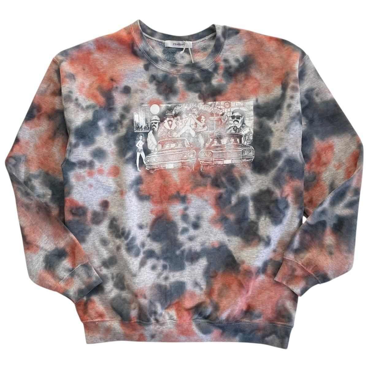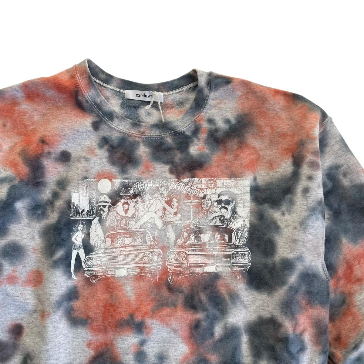 日本のTIE DYEアーティストのパイオニアであるDEAD DYEにタイダイ染をしてもらい、フロントにローライダーなグラフィック、バックプリントはチカーノアートコレクターでも有名なCheech Marinが出演映画での決めゼリフが大胆にプリントされたチカーノソウルスウェット。