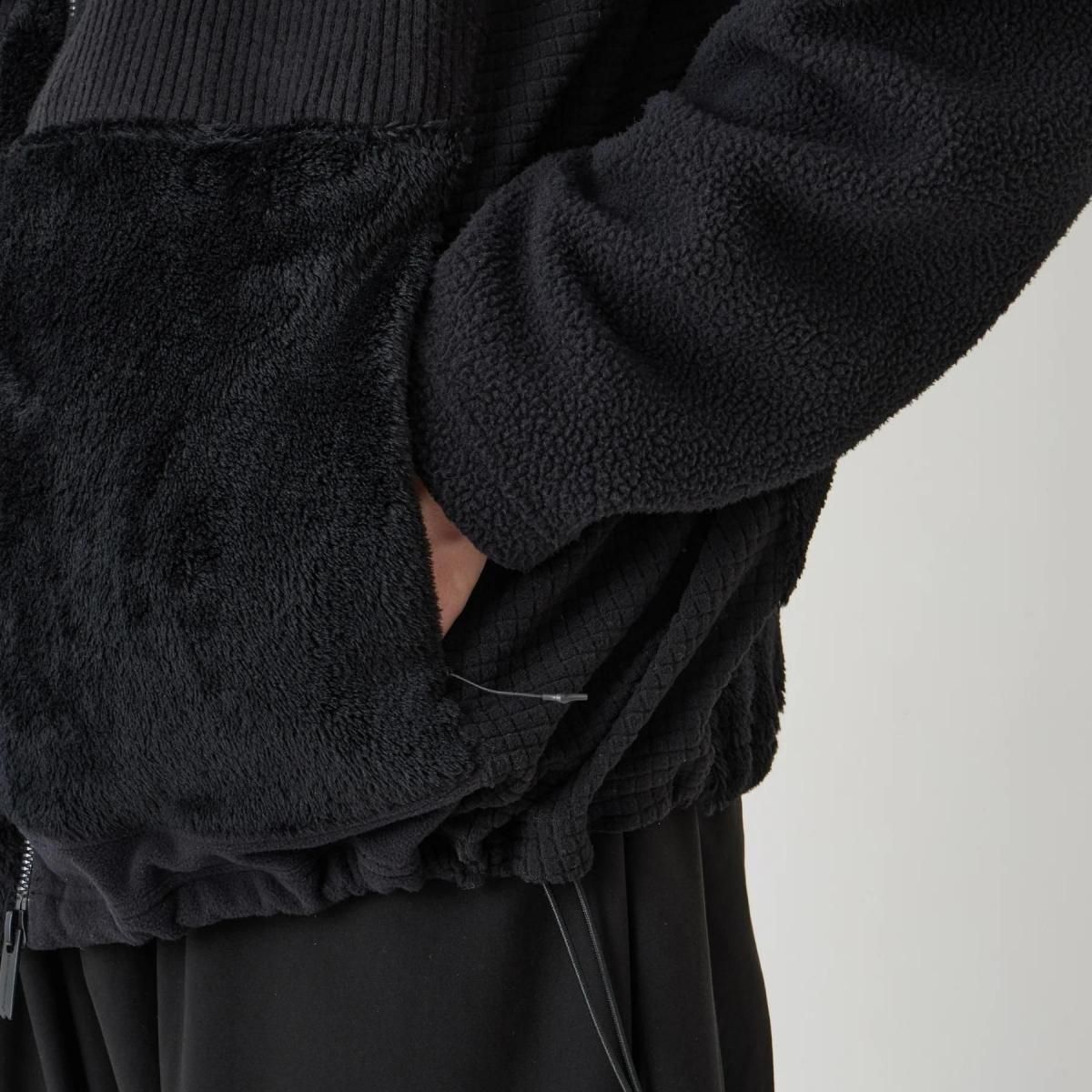 7種類の生地をランダムに掛け合わせたラグランブルゾン。メインは毛足の長いPOLATEC社のハイロフトフリースを使用。滑らかな肌触りと高い保温性がありながらも軽量で快適性のある素材になります。