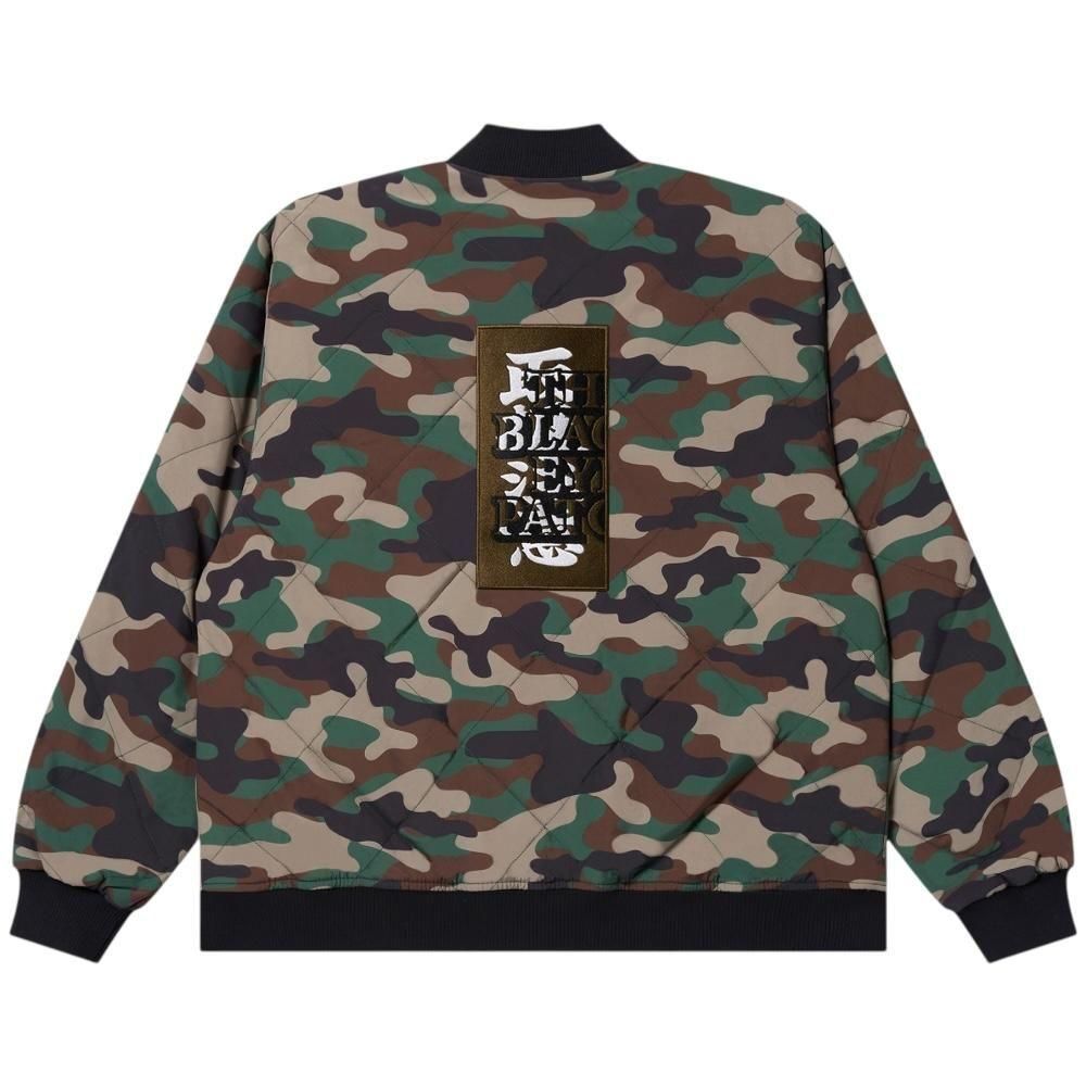 "取扱注意"の刺繍が背面に施されたキルティングジャケット。