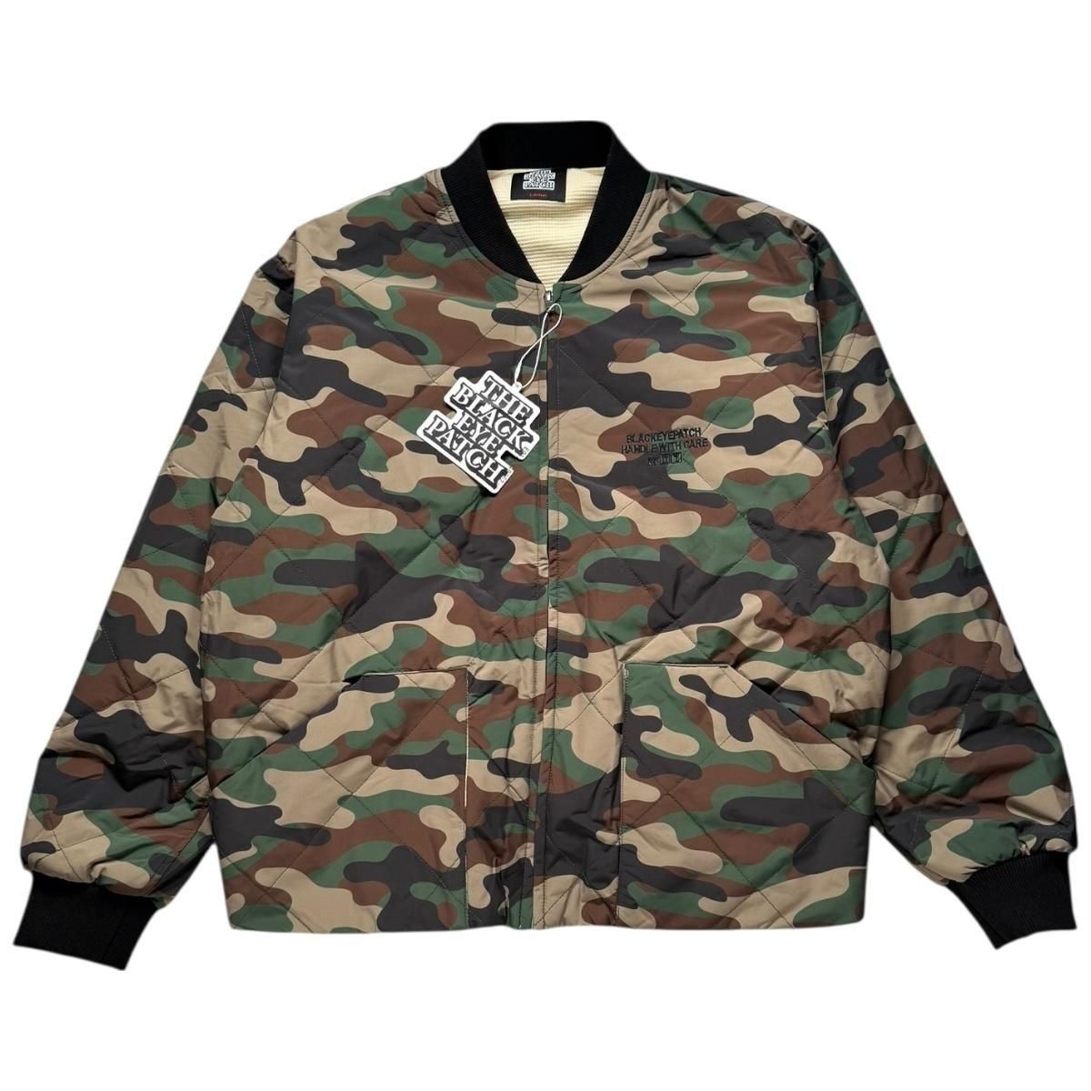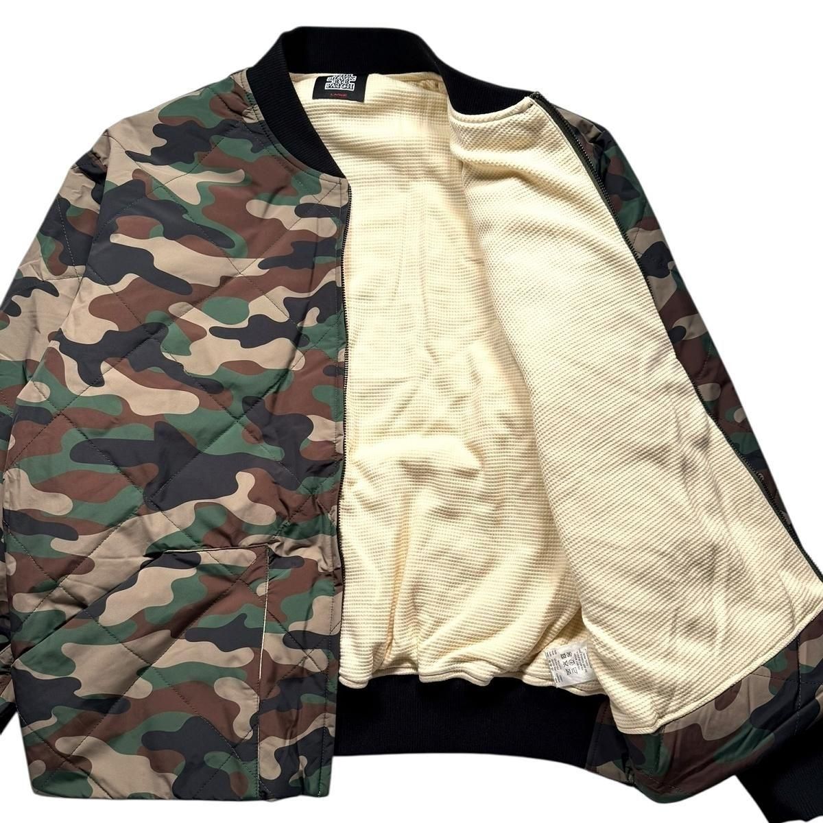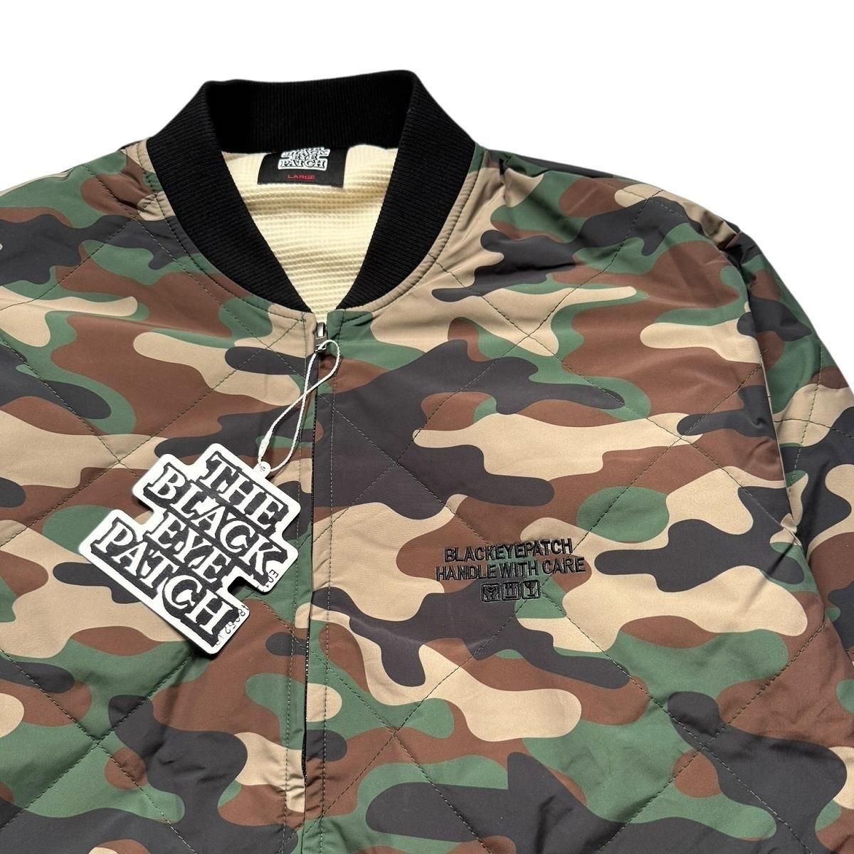 "取扱注意"の刺繍が背面に施されたキルティングジャケット。