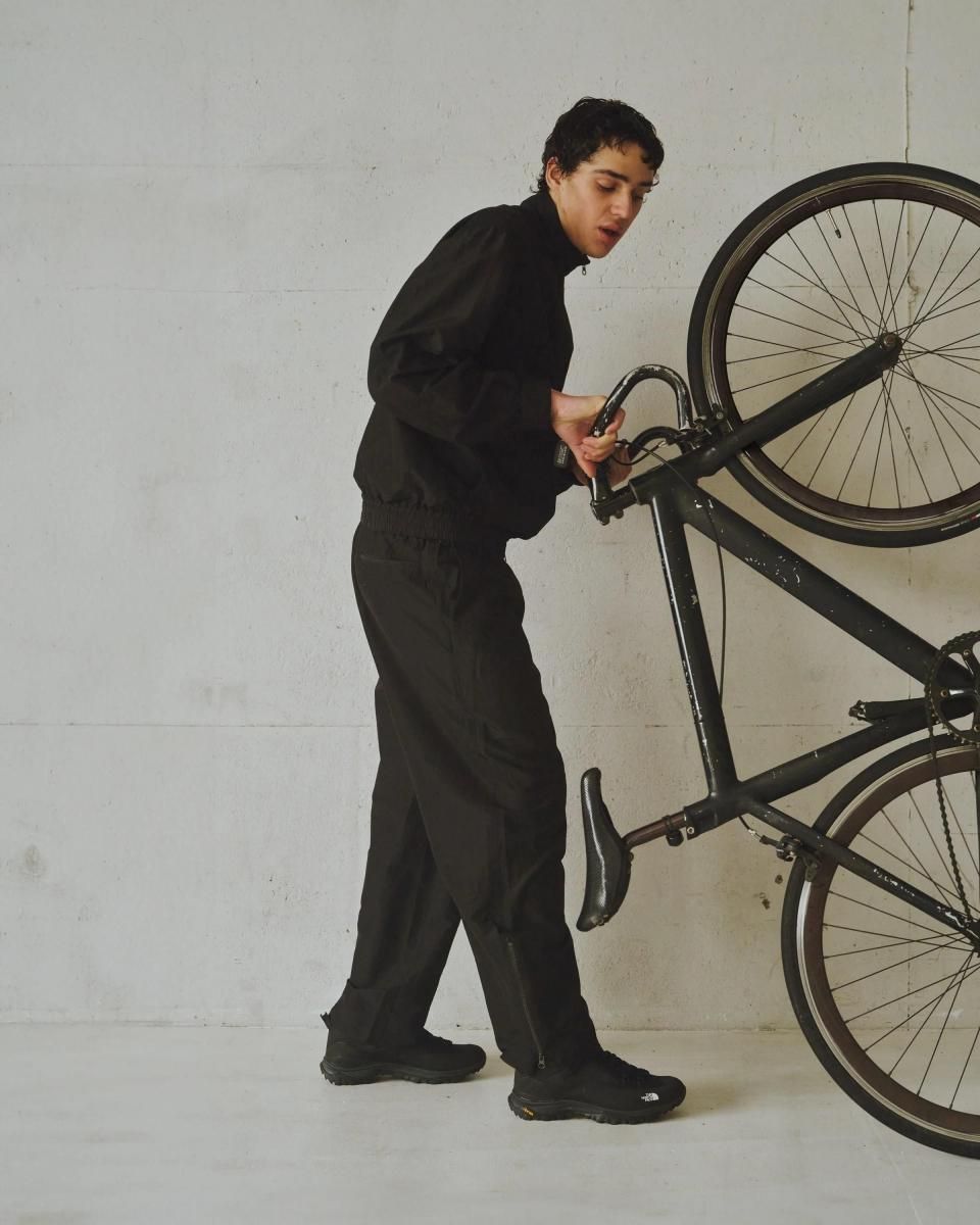 経糸には世界一高品質なブラジルBratac社のシルクを使用し、緯糸には72番双糸の細い糸を使用。奥から滲むような艶があり、品のある光沢が魅力で、ウールの柔らかさも同時に感じられます。Blackカラーのシルクに、ダークチャコールのウールを掛け合わせることで、奥行き感のある色合いを実現。ワンウォッシュ加工による自然なシワ感が、ラグジュアリーな素材にほどよいカジュアルさを添えています。