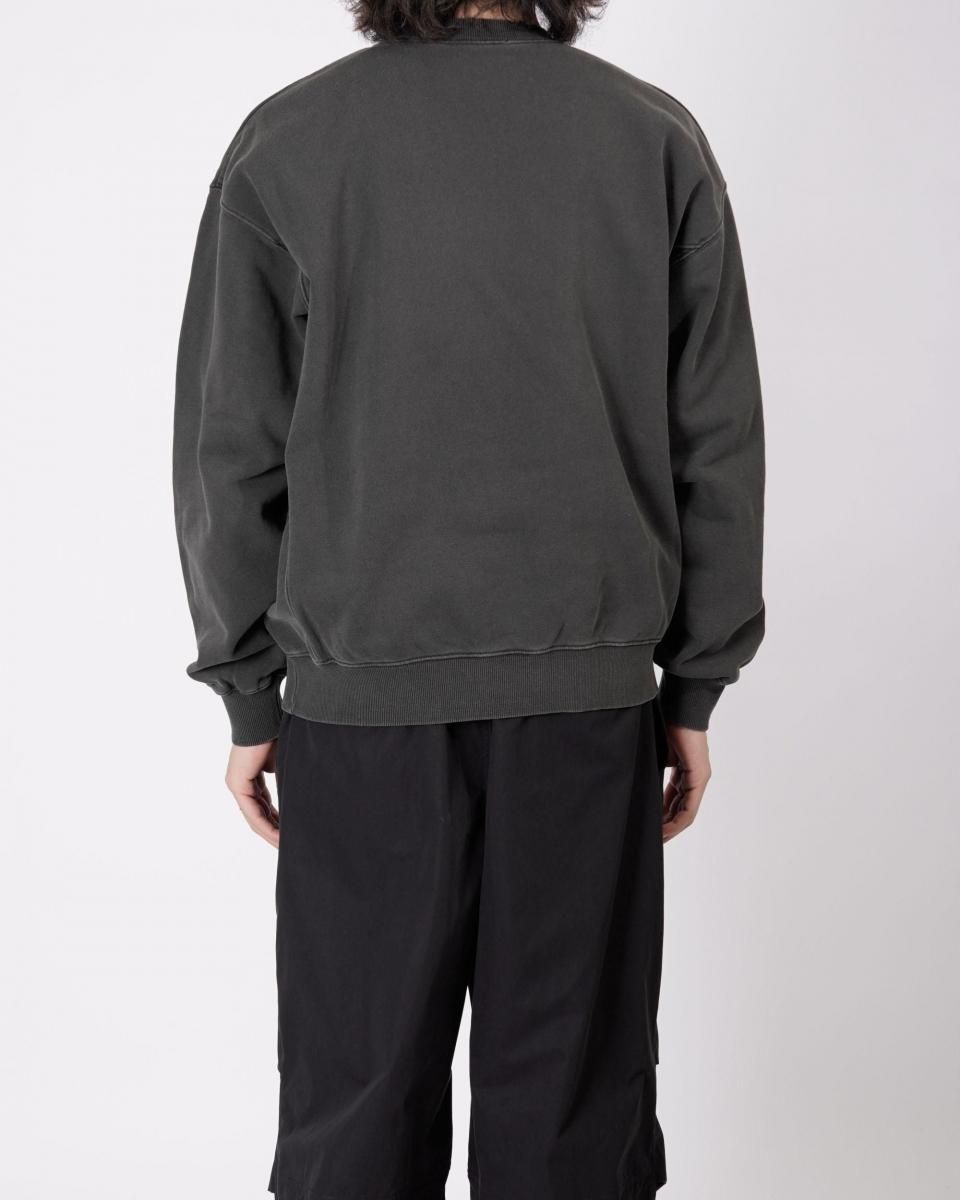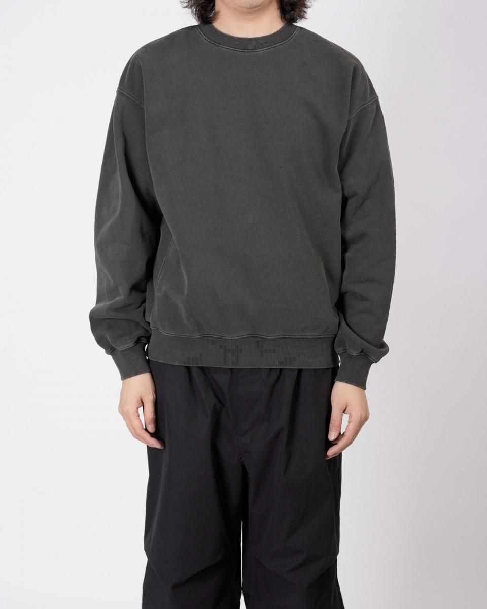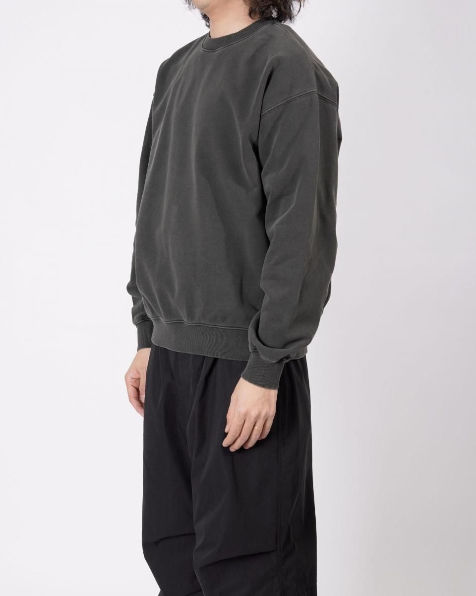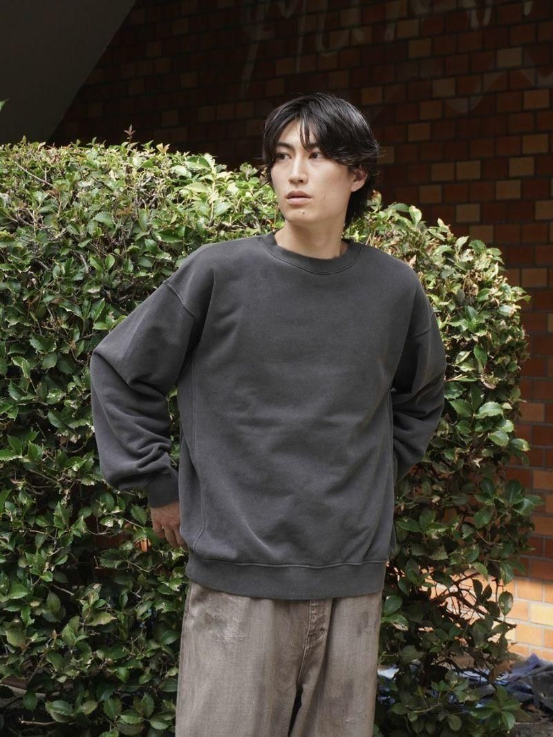 ピグメント加工+バイオ加工を施したクルーネックスウェット。古着ライクなフェードが特徴です。身幅をたっぷりと確保し、着丈はやや短めのシルエットに仕上げています。