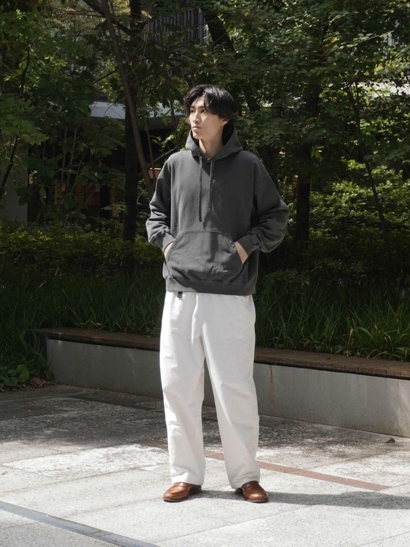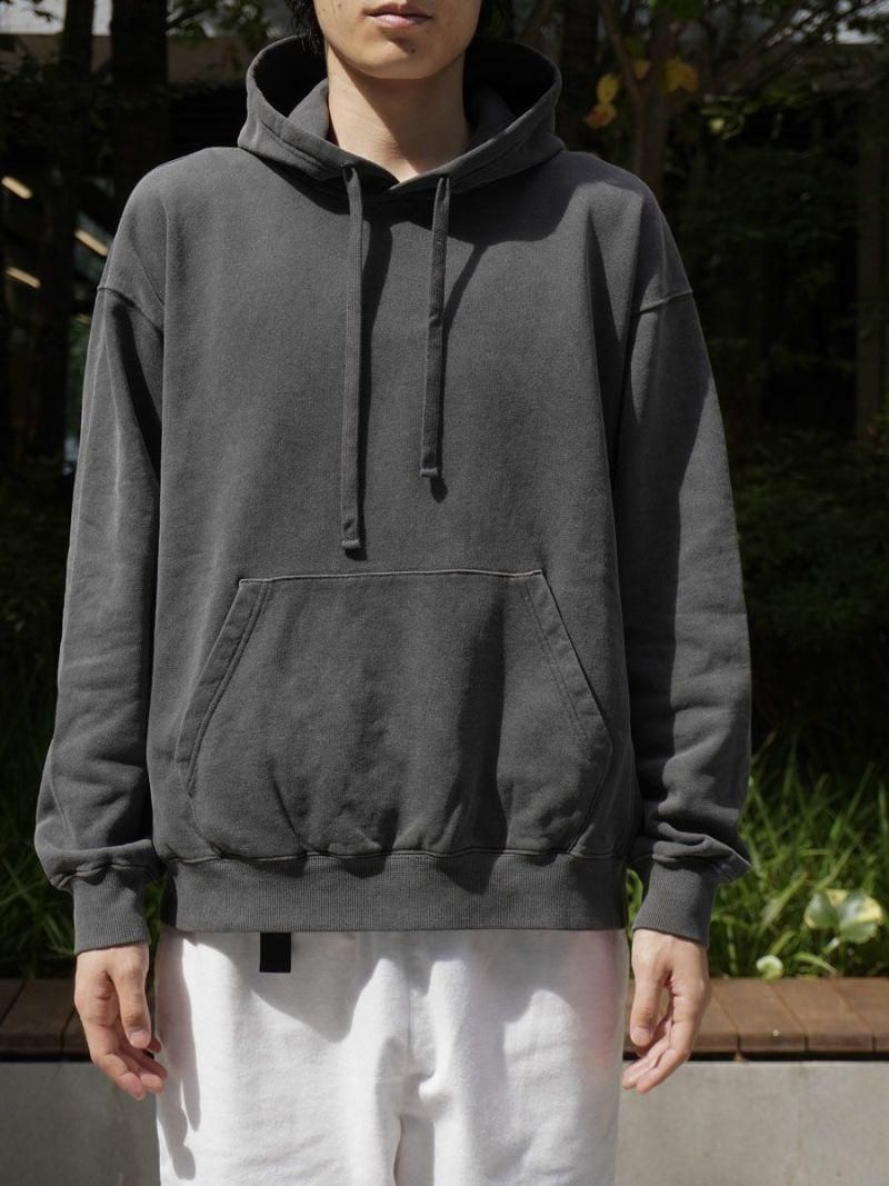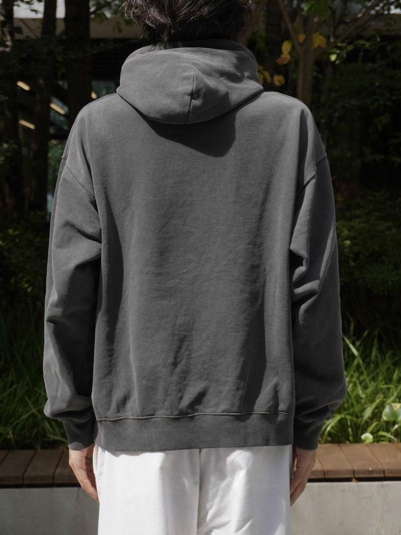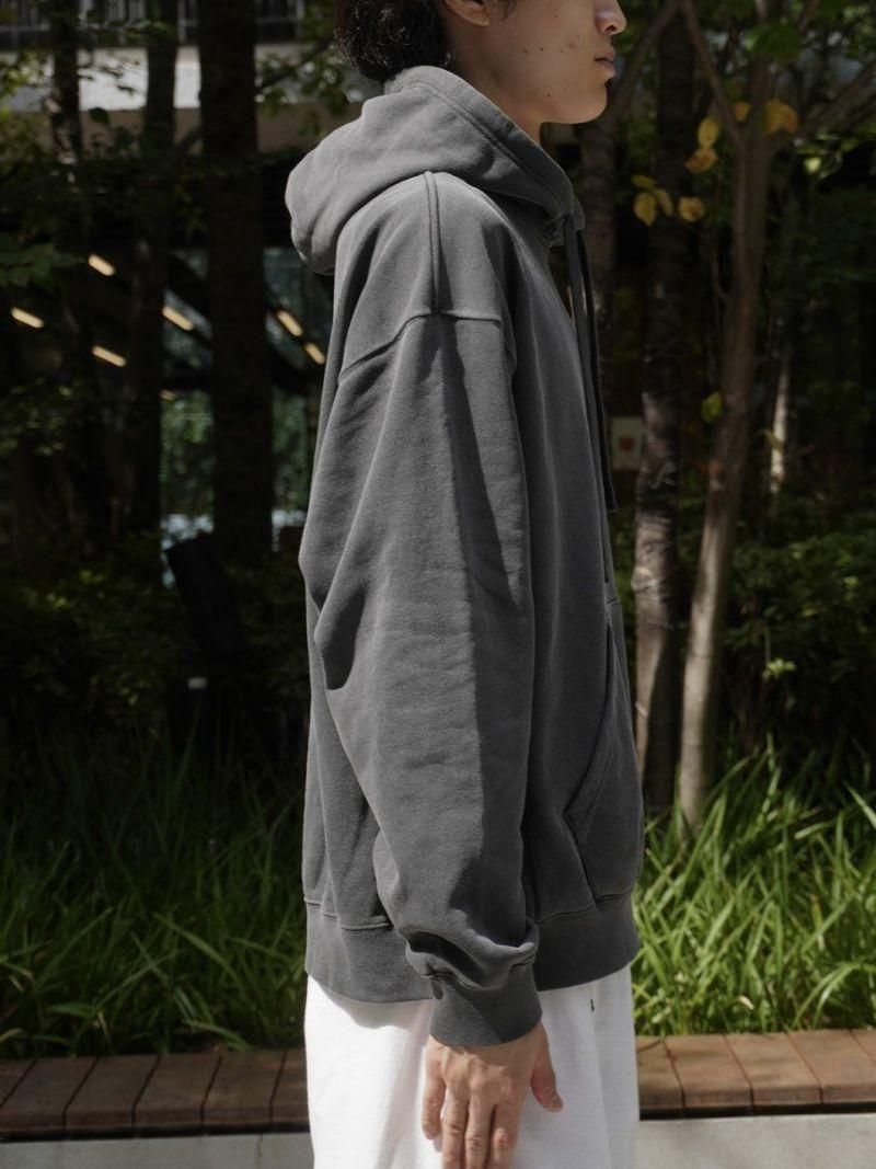 ピグメント加工+バイオ加工を施したスウェットパーカー。古着ライクなフェードが特徴です。身幅をたっぷりと確保し、着丈はやや短めのシルエットに仕上げています。少し大きめのカンガルーポケットがアクセントになっています。