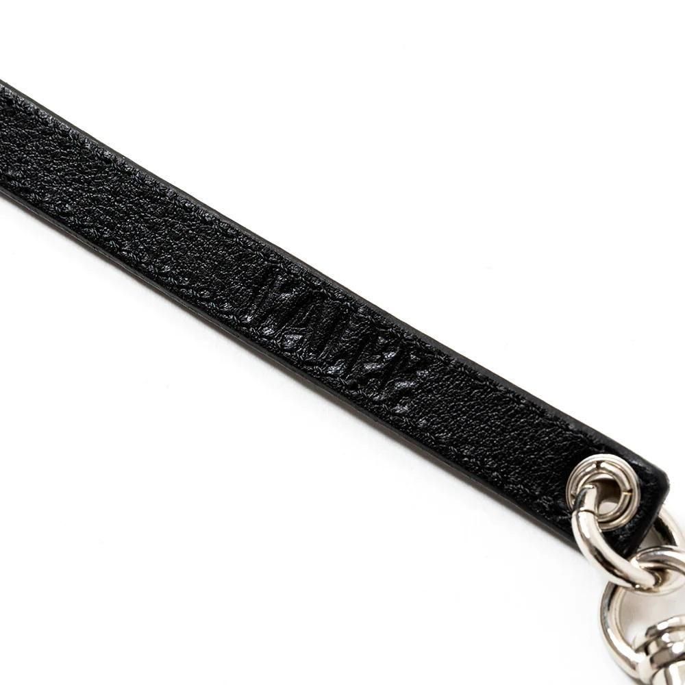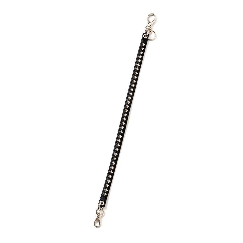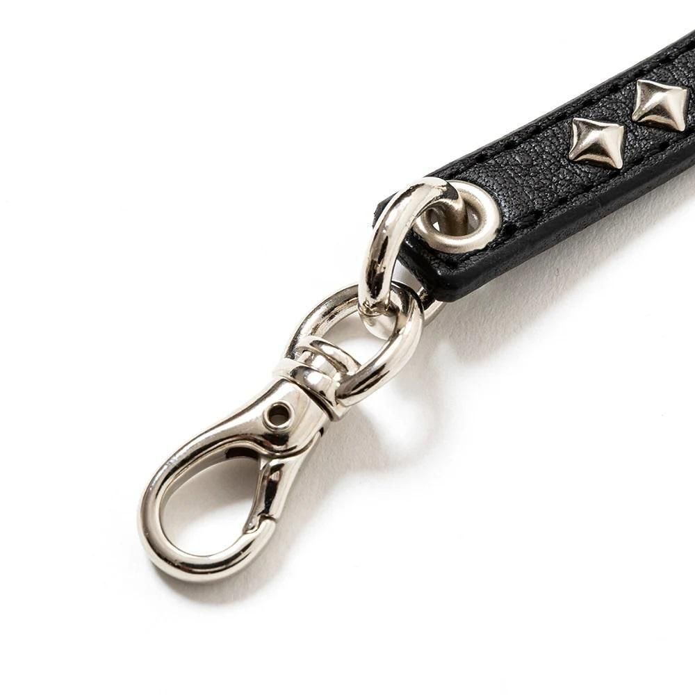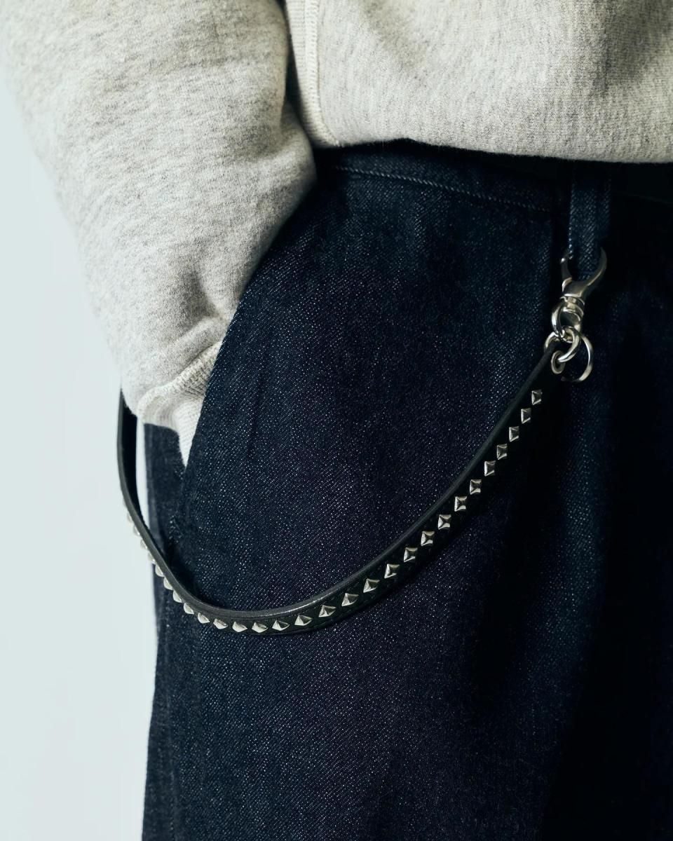 シボ感ある細めのレザーで作製されたウォレットコード。シボが特徴のレザーで使い込む程に、シボ感が消え、光沢感が出てくる経年変化。ピラミッド型スタッズを施したデザインワーク。