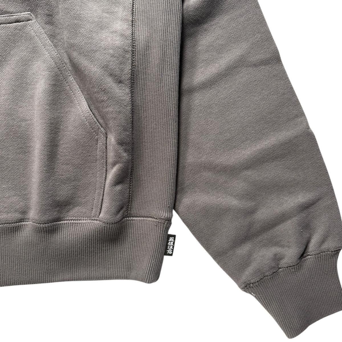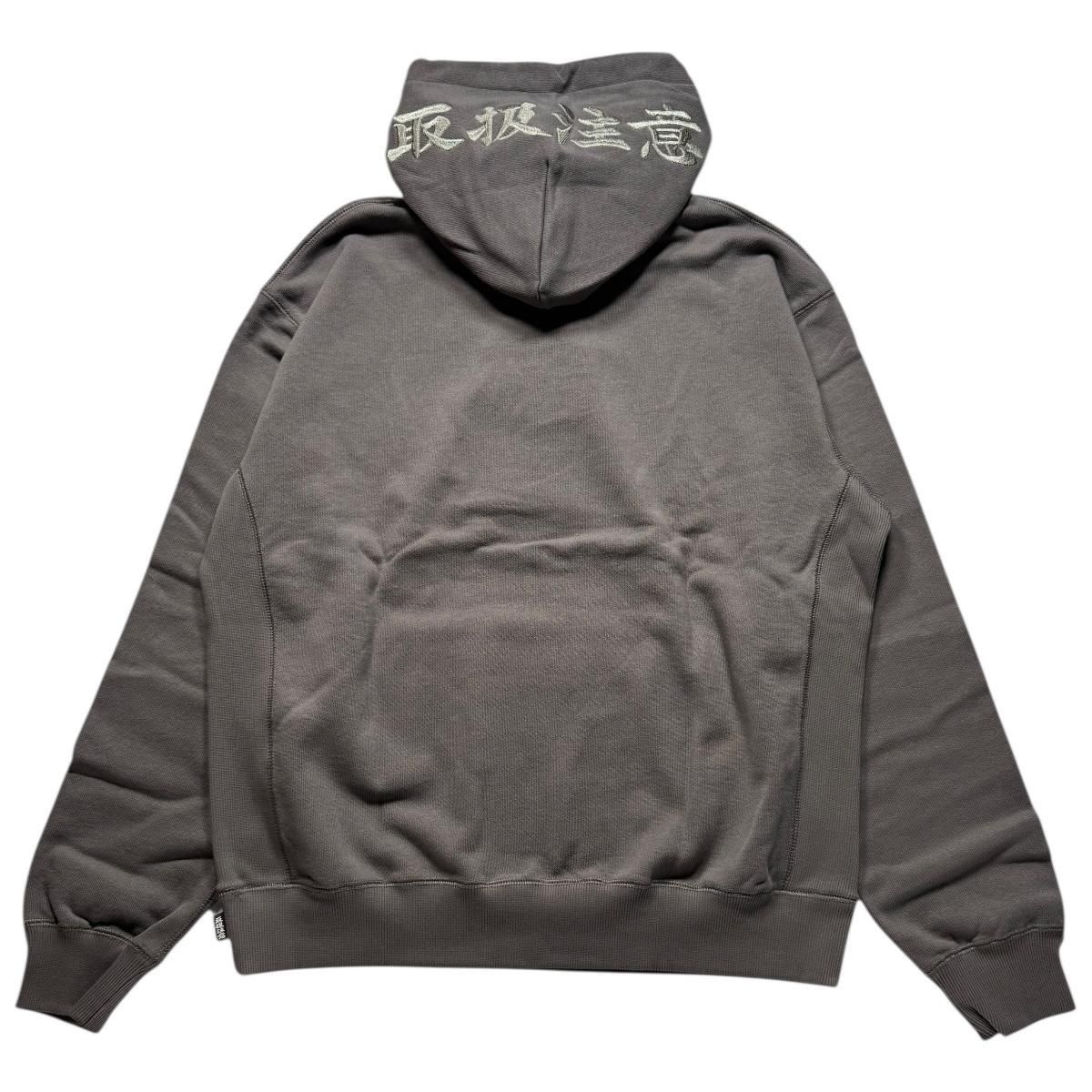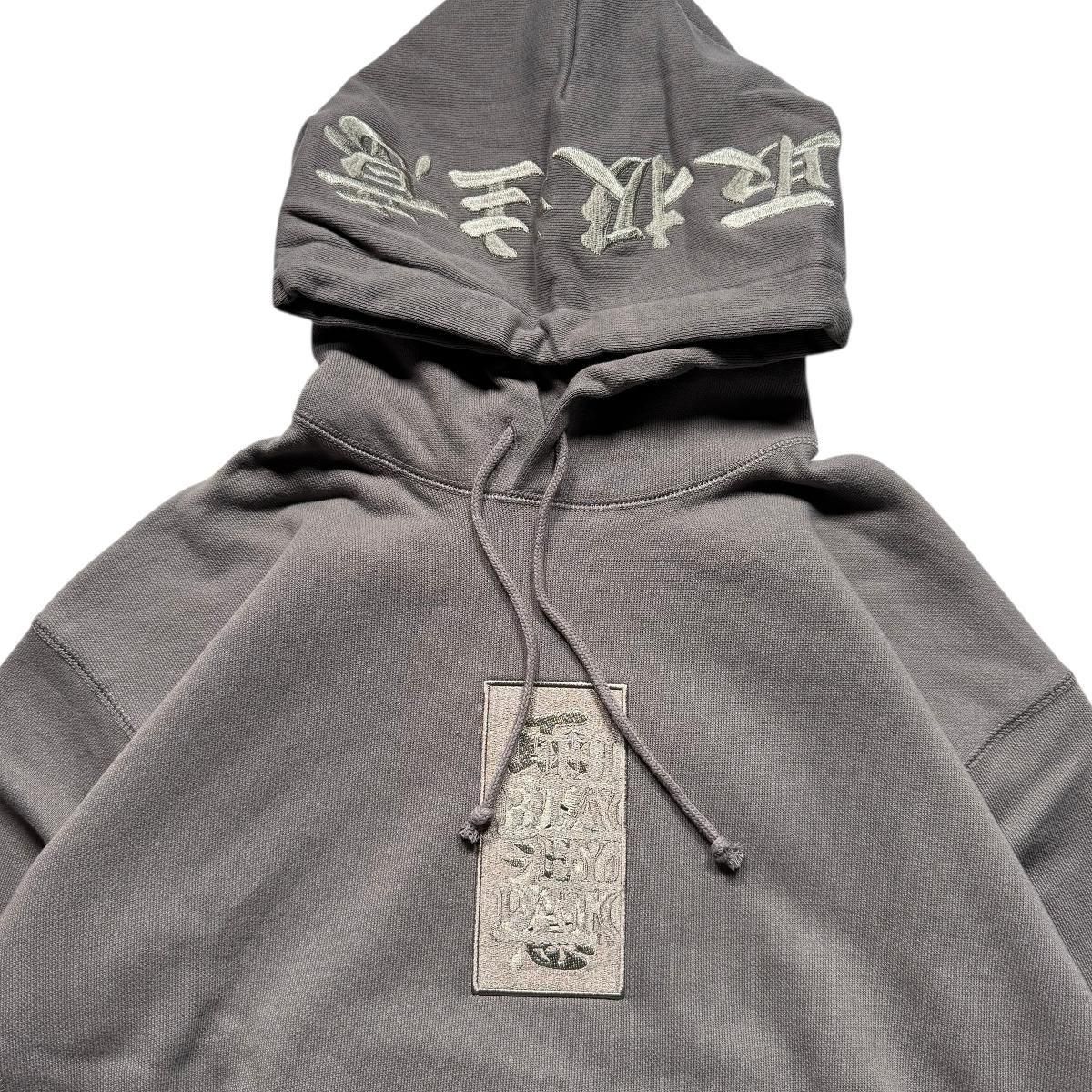 "取扱注意"LABELのグラフィックをボディと同色系で表現し刺繍で施したプルオーバーフーディー。
