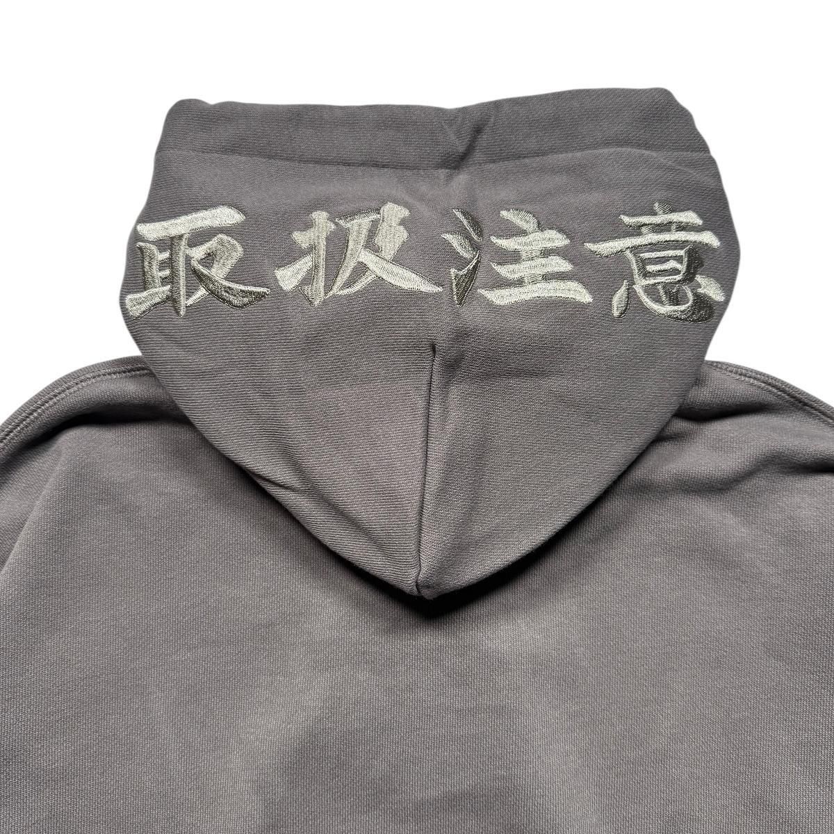 フード部にも"取扱注意"が同色系の刺繍で施される。