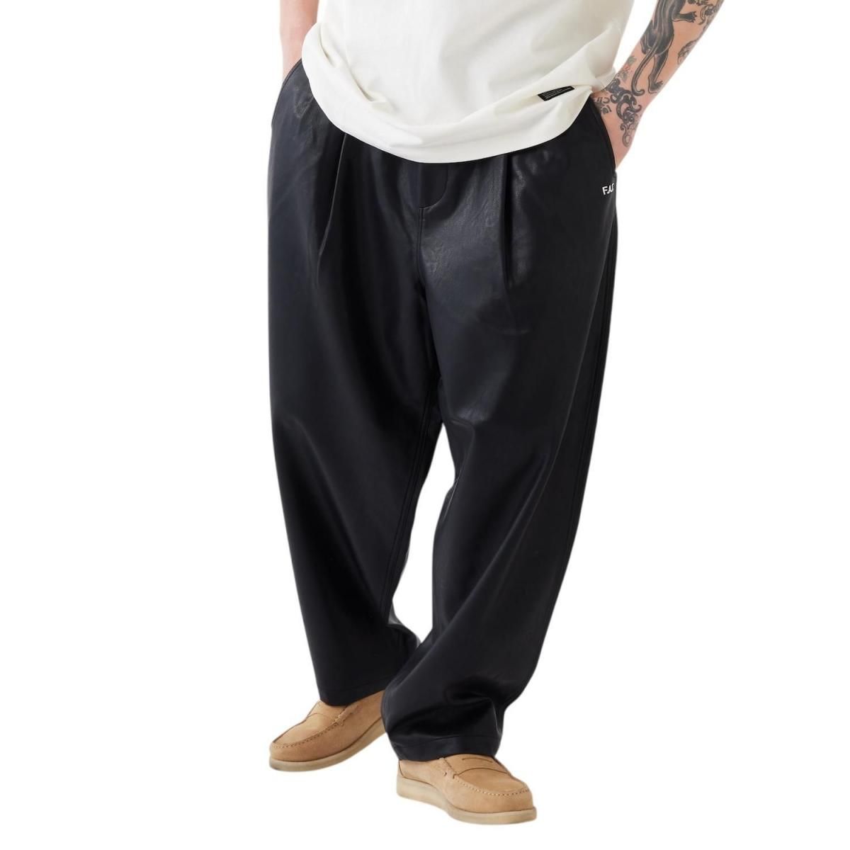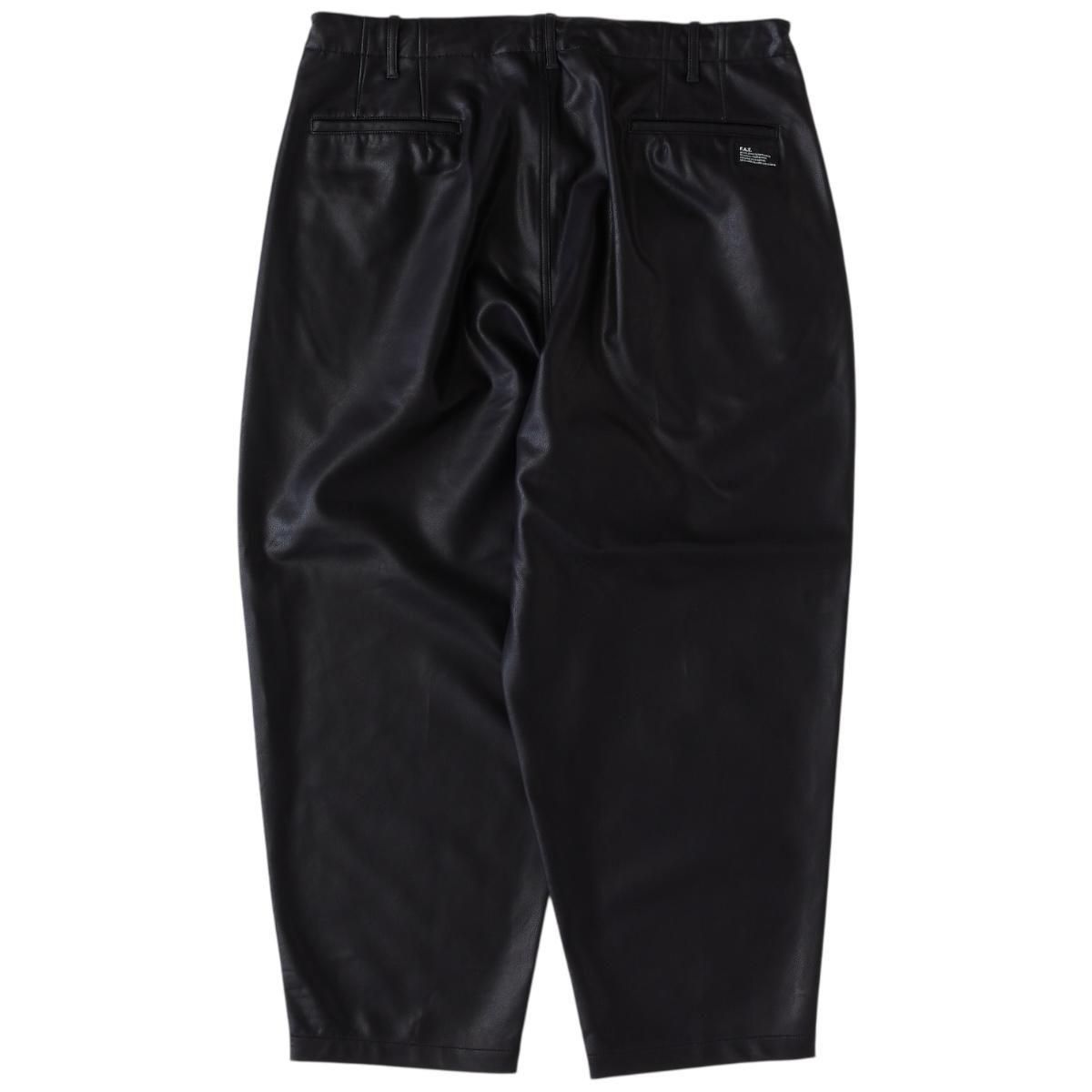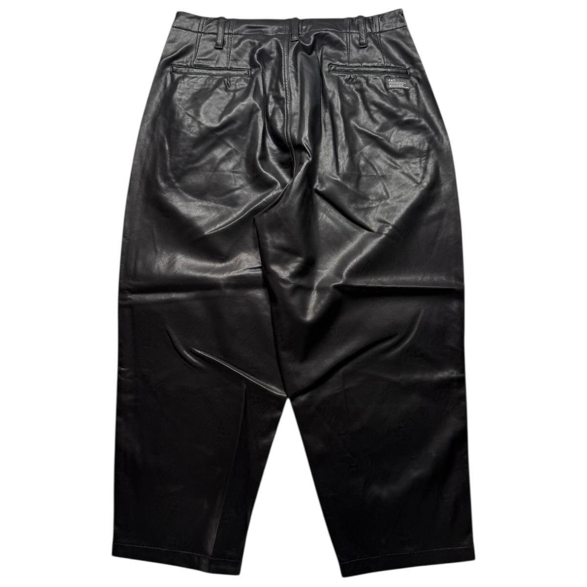 しなやかでキメ細かいシボ感が印象的な合皮素材を使用したワイドパンツ。股上を深くし、渡りを広くとることによりヒップから膝にかけてボリュームを持たせたワイドテーパードに加え、ジャストレングスによる独特なシルエットが魅力。穿き心地の良さはもちろんのこと、ドローコードを備え、ベルトレスでイージーパンツとして着用可能。フロントのロゴ刺繍とバックのブランドネームがさり気なく主張してくれる。