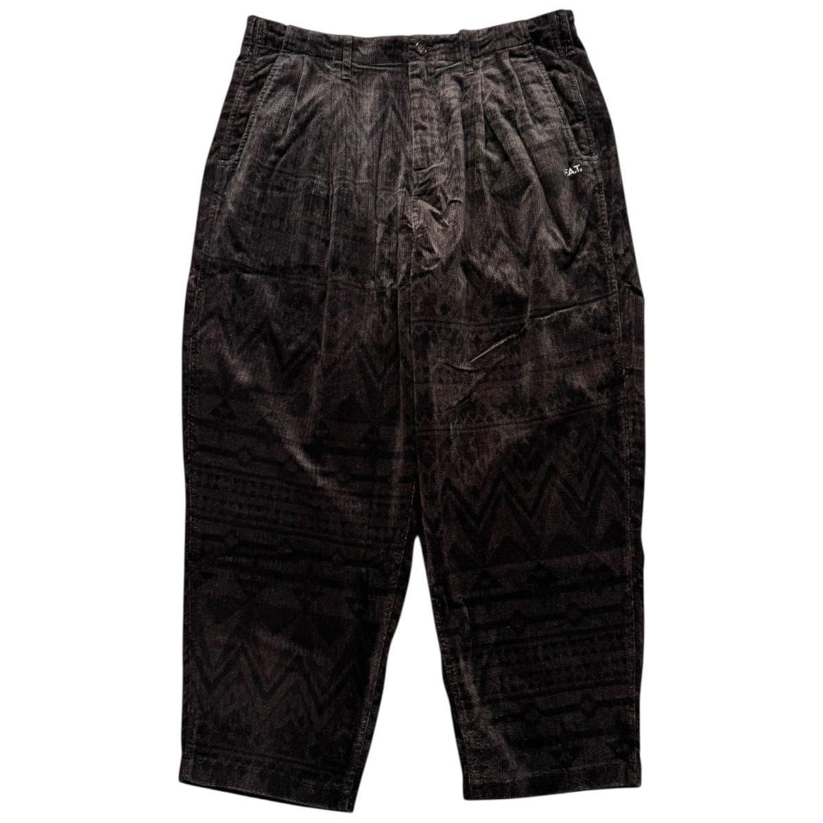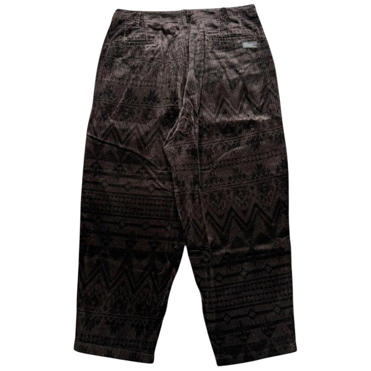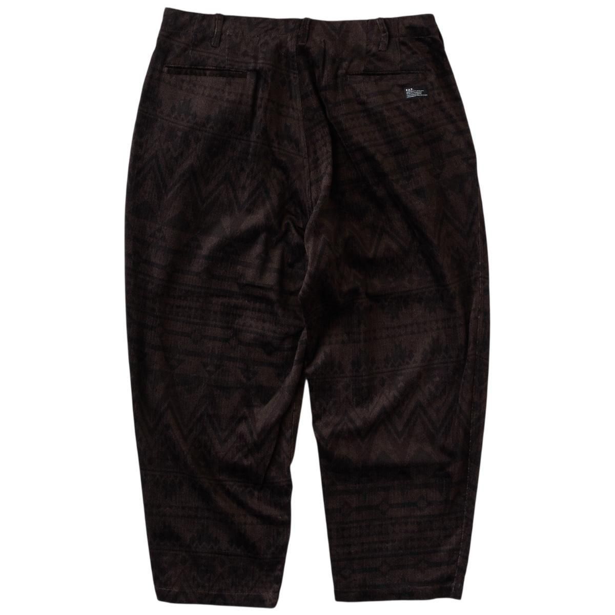 絶妙なダークトーンのネイティブプリントが印象的なコーデュロイ素材を使用したワイドパンツ。股上を深くし、渡りを広くとることによりヒップから膝にかけてボリュームを持たせたワイドテーパードに加え、ジャストレングスによる独特なシルエットが魅力。穿き心地の良さはもちろんのこと、ドローコードを備え、ベルトレスでイージーパンツとして着用可能。フロントのロゴ刺繍とバックのブランドネームがさり気なく主張してくれる。