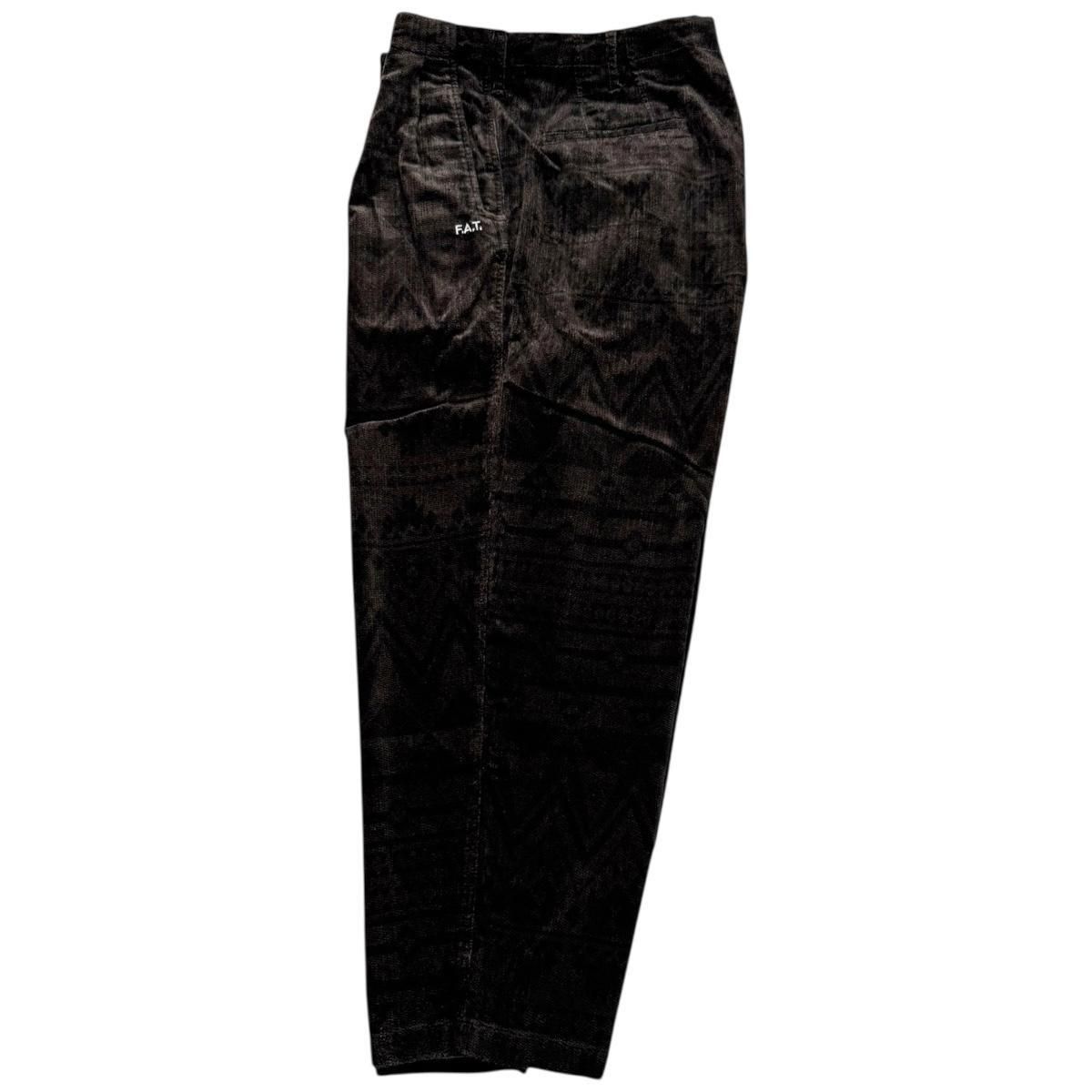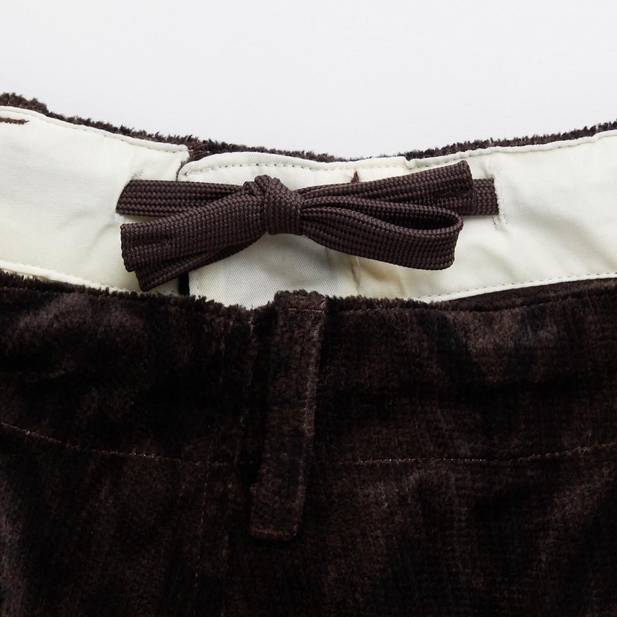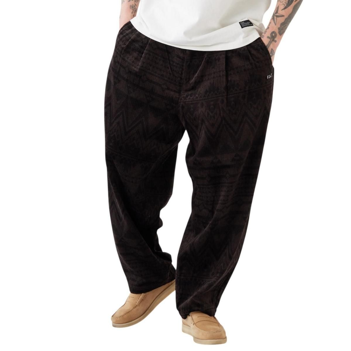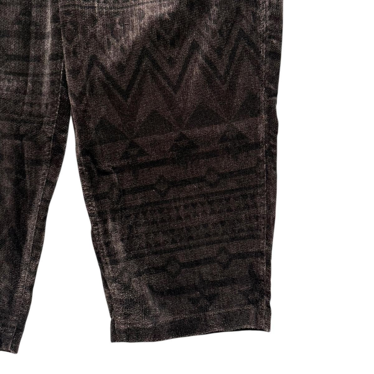 絶妙なダークトーンのネイティブプリントが印象的なコーデュロイ素材を使用したワイドパンツ。股上を深くし、渡りを広くとることによりヒップから膝にかけてボリュームを持たせたワイドテーパードに加え、ジャストレングスによる独特なシルエットが魅力。穿き心地の良さはもちろんのこと、ドローコードを備え、ベルトレスでイージーパンツとして着用可能。フロントのロゴ刺繍とバックのブランドネームがさり気なく主張してくれる。