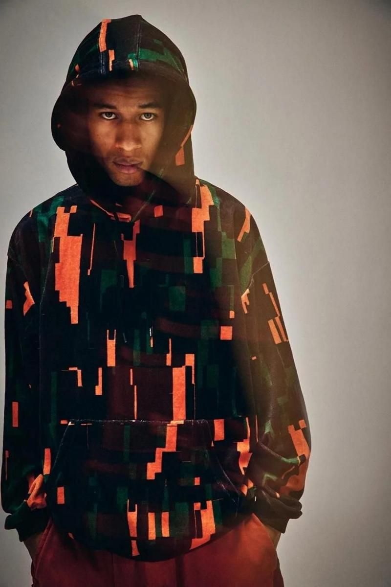 定番のべロア生地に総柄プリントした、ワイドシルエットのプルオーバーフーディ。