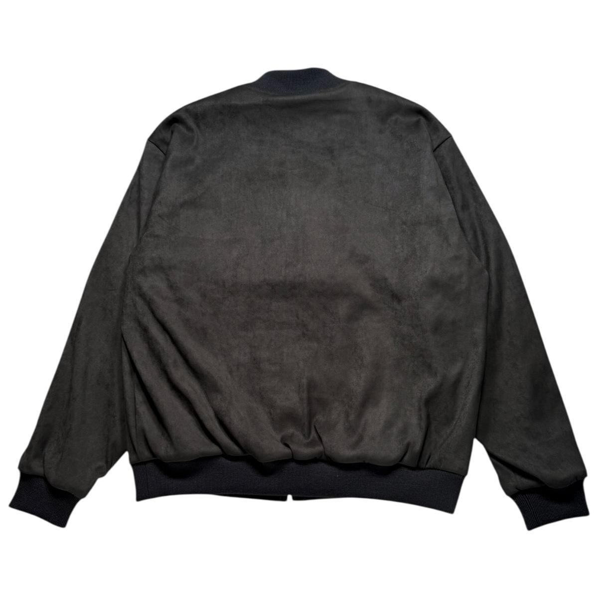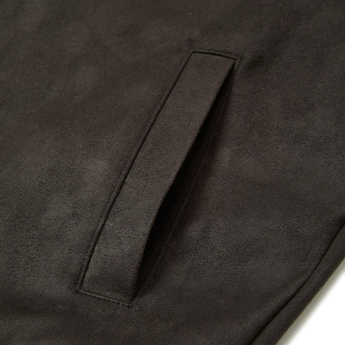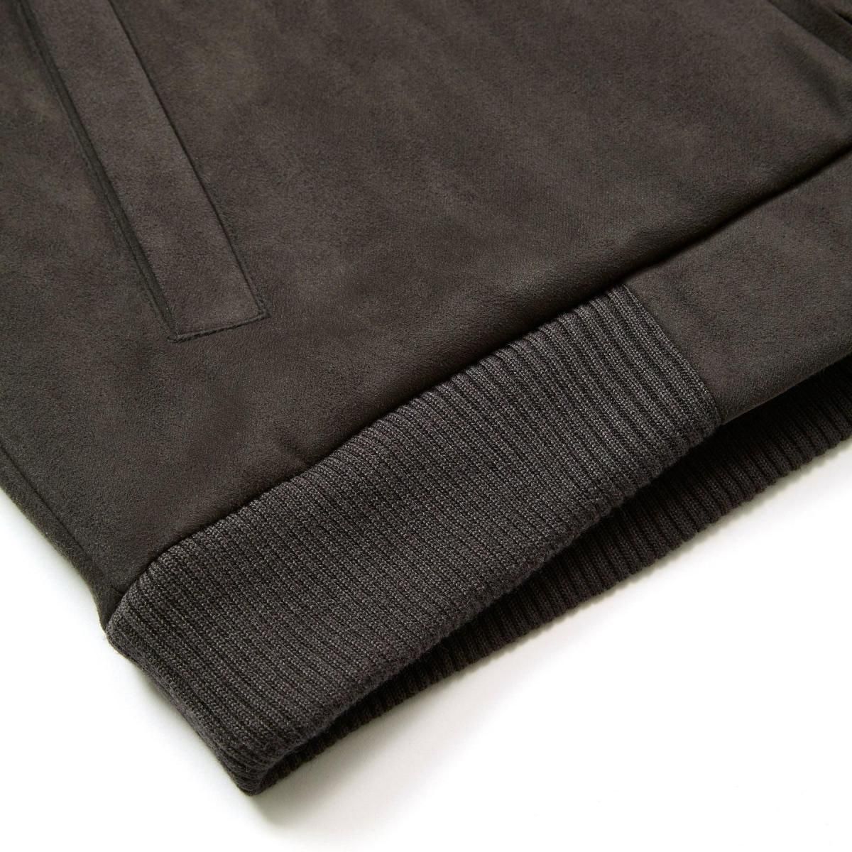 フェイクスエードリブジャケット。経糸にマイクロファイバーuts、緯糸にT400を使用したフェイクスエード生地を採用。高収縮糸を組み合わせ二重構造にすることで、強度と柔らかさを兼ね備えているのが特徴。身幅にゆとりを持たせたシルエット。ショルダー部分にフェイクレザーパイピングを施し、裏地はオリジナルペイズリー柄、左胸に刺繍が入る。