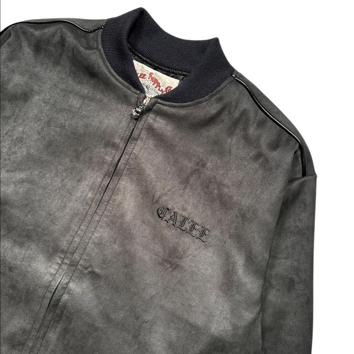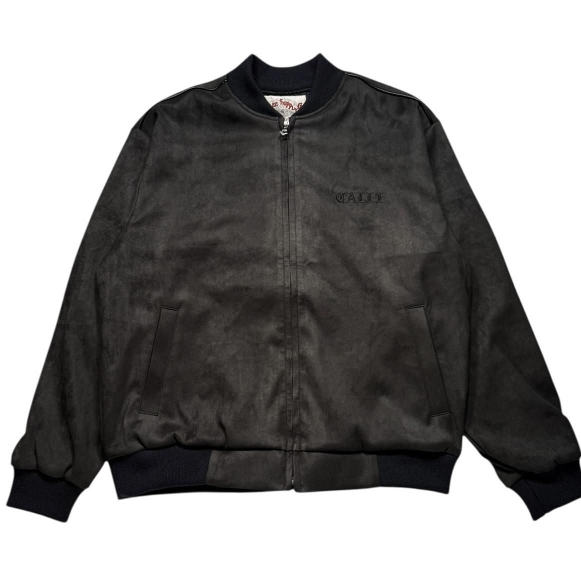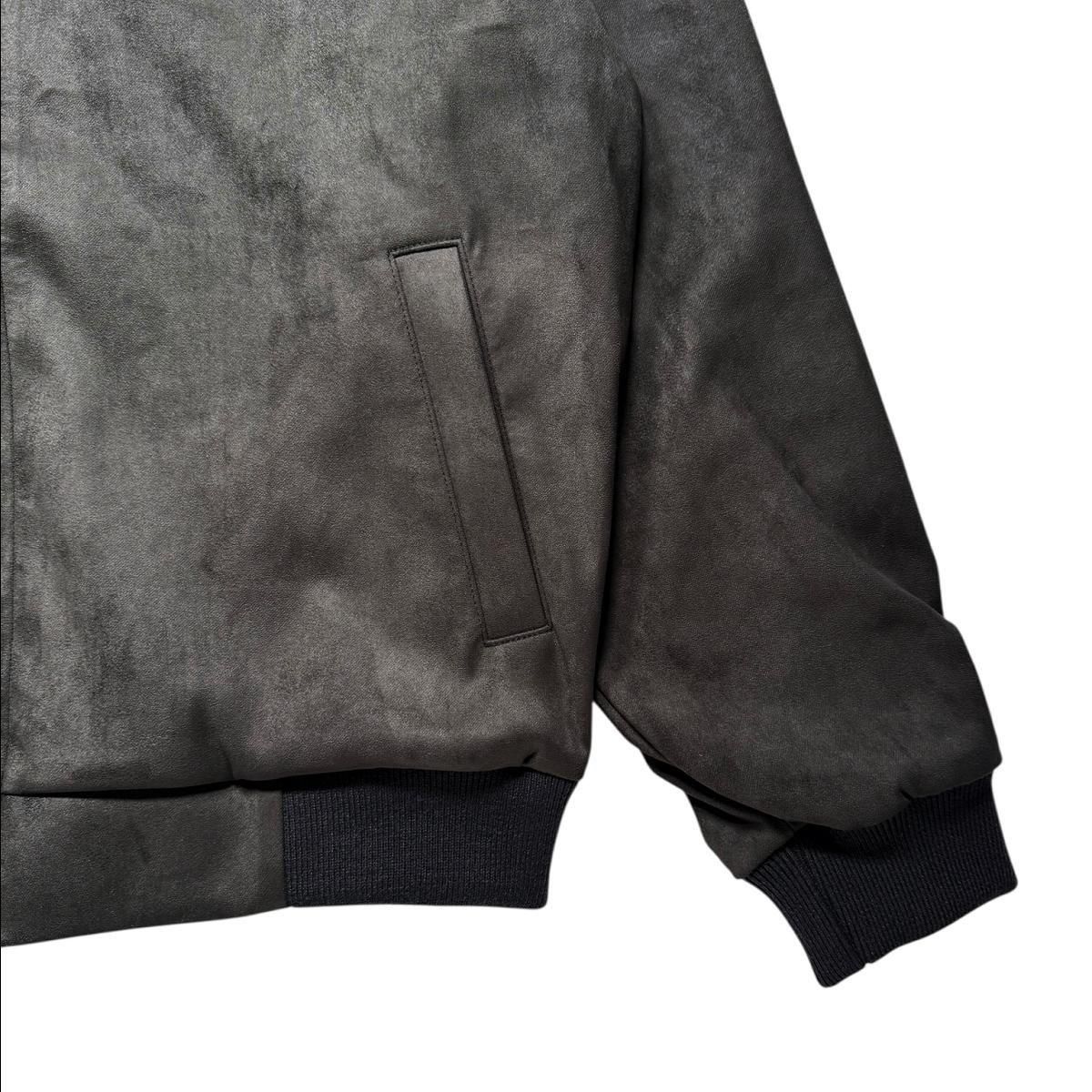 フェイクスエードリブジャケット。経糸にマイクロファイバーuts、緯糸にT400を使用したフェイクスエード生地を採用。高収縮糸を組み合わせ二重構造にすることで、強度と柔らかさを兼ね備えているのが特徴。身幅にゆとりを持たせたシルエット。ショルダー部分にフェイクレザーパイピングを施し、裏地はオリジナルペイズリー柄、左胸に刺繍が入る。